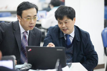 南方泵業(yè)總裁沈鳳祥先生與陳羽天老師溝通授課及課件設(shè)置